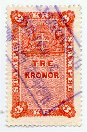 A Swedish documentary revenue stamp, used from 1895 to 1968 when a new issue of different design was released. Values went from 5 ore to 25000Kr and maybe higher. Wavy line watermark with 3 different perforations: 11, 12.5 or 13. |