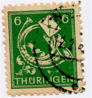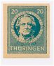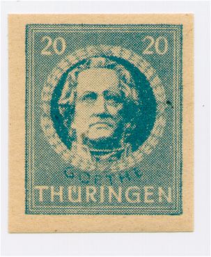 Thüringen (around Erfürt), Germany, Sovjet occupation 1945-1946 6 pf green Yvert Nr 4, 20 pf blue Yvert Nr 7, 12 pf pink Yvert Nr 6 Please note that stamps Nr Yvert 1 to 8 are with "gomme économisée": The back of the stamps has a pattern of circles; only the intervals between the circles wear the gum: ![]() The same stamps do exist under Yvert Nrs 9 to 16 "Pleine gomme" (Fully gummed) Apart from the already mentioned stamps from Thüringen (Yvert 1 to 8, 17 to 20 + BF 4), this is also found on n° 10 and 12 from Eastern Saxony, n° 37 to 39 from Western Saxony, as well as on all or part of the local issues from the cities of Finsterwalde, Görlitz and Plauen. |