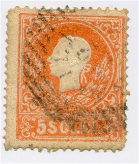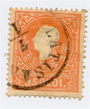 5 soldi instead of 5 Kroner. Actually it is from Lombardy Venetia, 1859-62 2 soldi, type ll, block of 4. (Yv 16) Other pictures here. |
