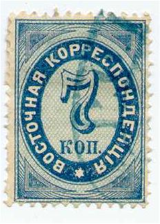 Vostotchnaja korrespondenchia? Value 7 kopek. Could be a local stamp from Vostochnaya. Unfortunately there are at least eight places of that name in Russia. Someone else mentioned that it looks very much like Scott Russian Offices in the Turkish Empire #26 of 1884. |
